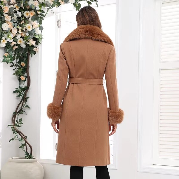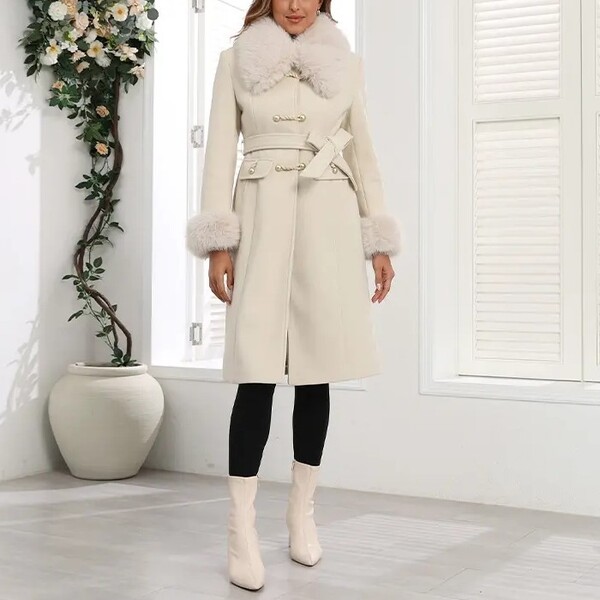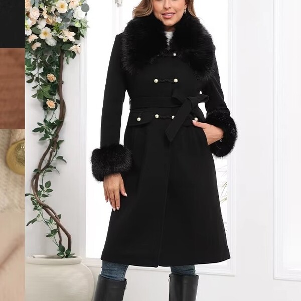 Feature: High quality fabric, Faux fur trim, Double-breasted buttons, Adjustable belt at waist. Faux fur collar and cuffs for added elegance.