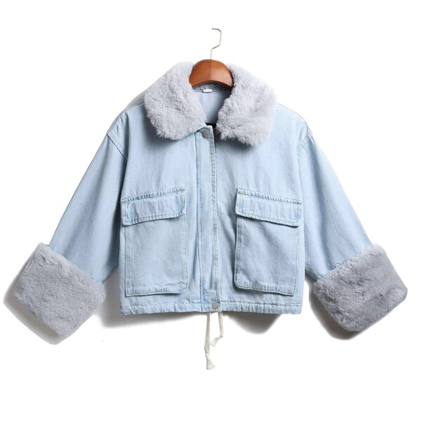 3Pcs Winter Denim Fox Fur Patchwork Fur Coat